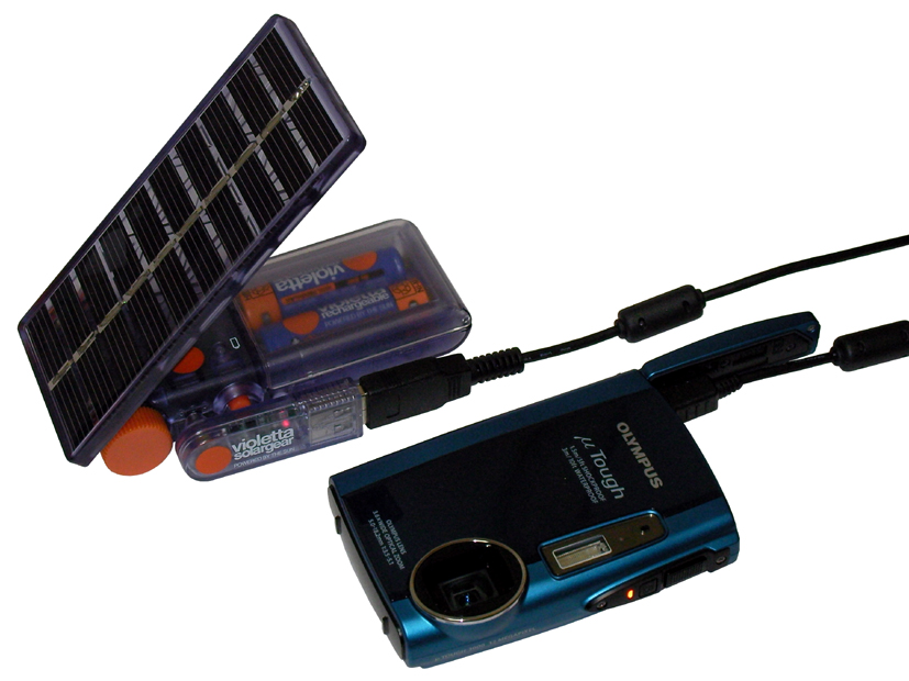 ■モバイル太陽電池「バイオレッタ ソーラーギア VS01」に装着し、携帯電話、PDA、携帯型AV機器など、DC4V〜6V入力のモバイル機器に市販のUSB充電ケーブルで接続することにより、それらの機器の電池を充電できます。充電式ニッケル水素電池「バイオレッタ」を事前に充電しておけば、日射のないときでも使用できます。