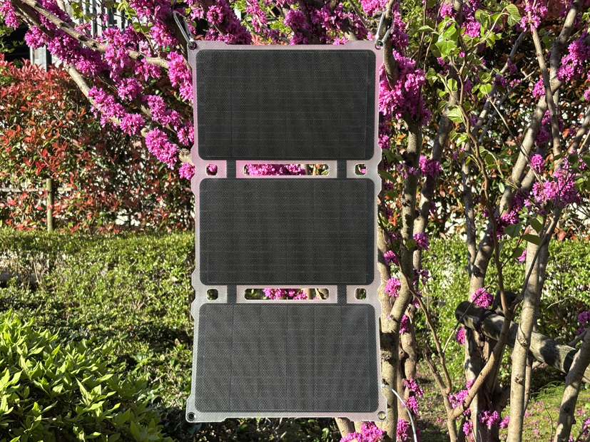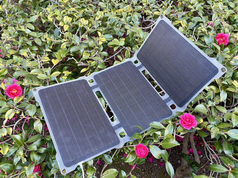 ■エネルギー変換効率24%の高性能単結晶シリコン太陽電池セルを光透過率が高く長寿命なETFE樹脂にてラミネートした、薄型軽量で割れにくい、収納時A4サイズの三つ折り太陽電池パネルです。
